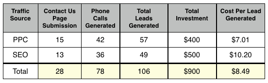 B) The following is a breakdown of the number of leads generated and whether they originated from PPC or SEO traffic. I've used our monthly investment to calculate the cost per individual lead so we can determine which campaign is more profitable.