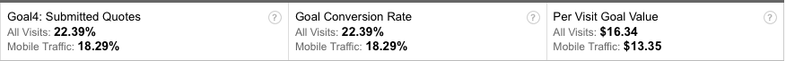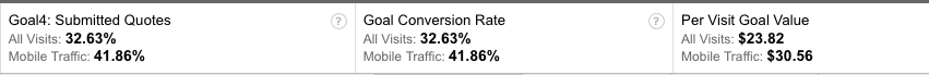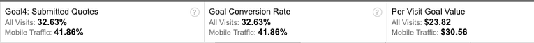 In this example, we've attributed an economic value to the act of submitting a Quote Form and are comparing the performance of our mobile data to non mobile data for our Google advertising campaigns. This will allow us to quickly analyze the effectiveness of our mobile campaign for paid traffic. Similarly, we can do the same for organic, or non-paid traffic: