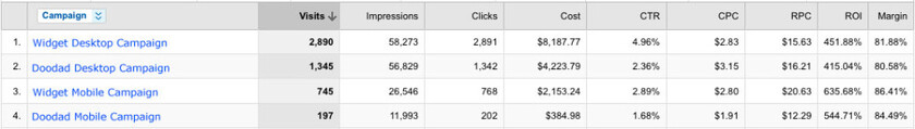 This chart further breaks down the revenue per click, ROI, and Margin. From this report we see that our mobile campaigns, while not as large as our desktop campaign, have a stronger KPIs (namely revenue per click, or RPC, ROI, and Margin). So while we can't expect to replace our desktop campaign with mobile (yet), the data speaks to the value of our mobile audience and their contributions to our site's goals.
