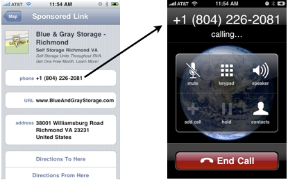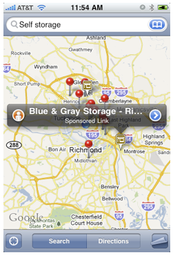 When someone performs a search for a local business on a smartphone, it uses a series of tools including GPS technology, map data and local business listings to display relevant businesses near your area. Here's an example of a user with local intent searching for a self storage company on his iPhone.