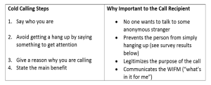 The two most important elements are 1) the WIFM (what’s in it for me – the prospect) and 2) a referral name. When cold calling, get to the WIFM step (Step 4) as quickly as possible without missing steps 1-3, and drop a name or two on your way there.