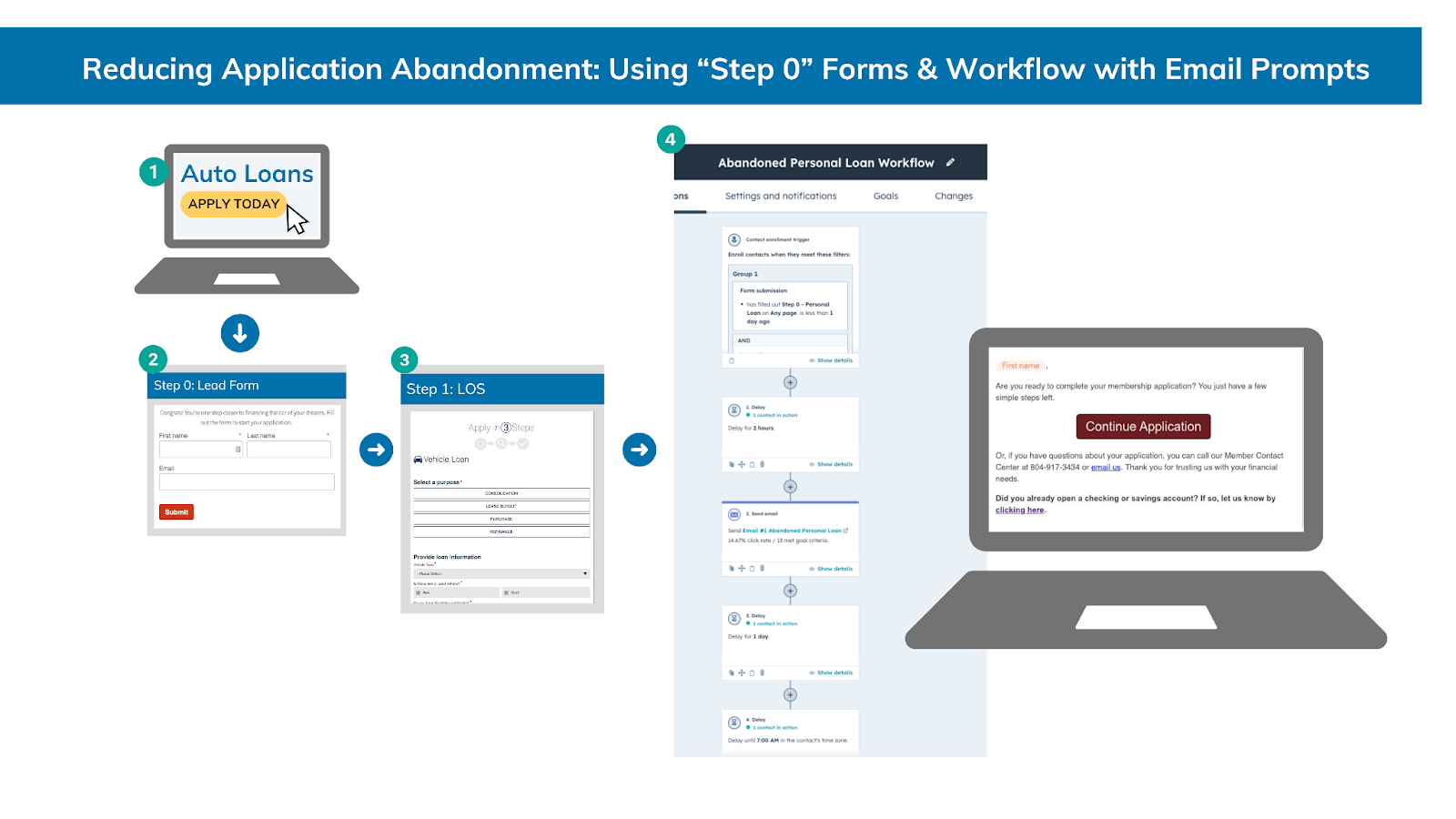 For some credit unions, this simple workflow has recovered up to 35% of abandoned applications. To put that in more specific terms, let’s say 1,000 people begin your auto loan application. Using our benchmark 28% loan application completion rate, those 1,000 “starts” resulted in 280 auto loan applications (meaning 720 people abandoned the application somewhere in the process). If we can recover 35% of those 720 abandoned apps, we’ll bring in an additional 252 applications, nearly doubling the original amount.